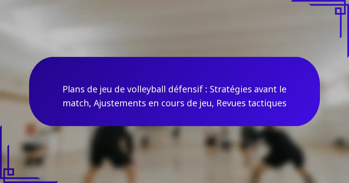 Les plans de jeu défensifs au volleyball sont cruciaux pour le succès d’une équipe, en commençant par des stratégies efficaces avant le match qui mettent l’accent sur l’analyse de l’adversaire et les rôles des joueurs. Pendant le match, les équipes doivent rester adaptables, en effectuant des ajustements en cours de jeu basés sur des observations en temps réel pour contrer les tactiques de l’équipe adverse. Les revues post-match axées sur les indicateurs de performance clés affinent davantage les stratégies défensives, garantissant une amélioration continue et une préparation pour les défis futurs.